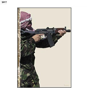 Pappersmål - Terrorist 9RT föreställer en kombatant från sidan, beväpnad med en AKS74u.